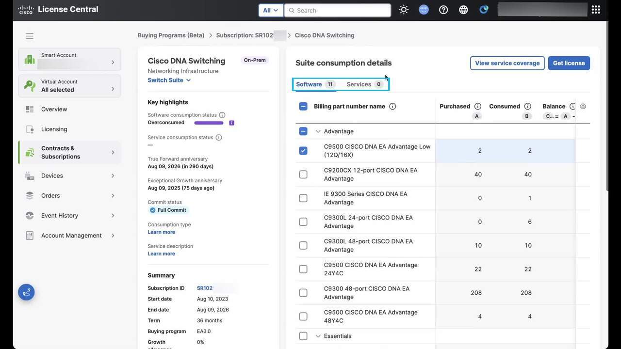 View the Service Coverage information about my Buying Program (BP) suites, in Cisco License Central (CLC).