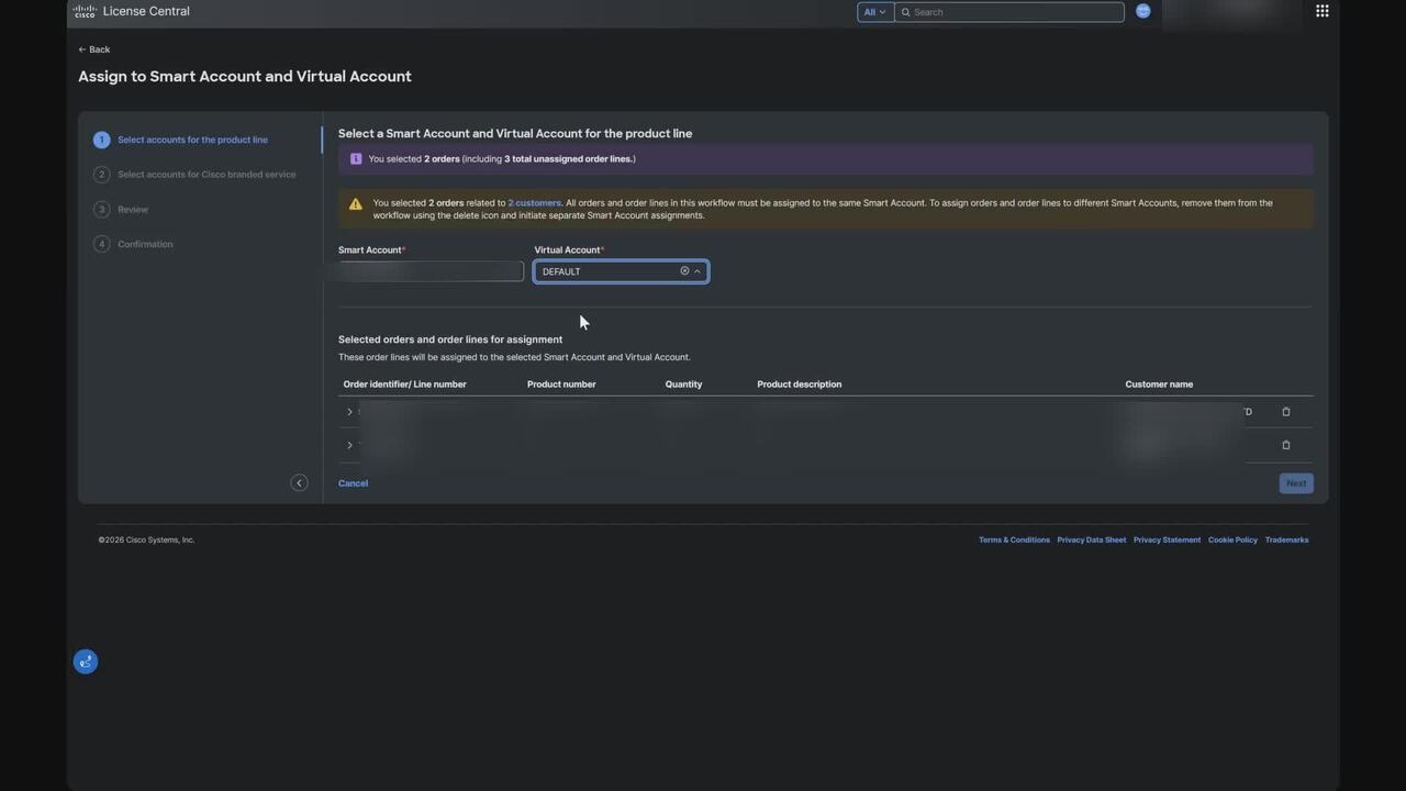 Assign an order to a Smart Account, in Cisco License Central (CLC)