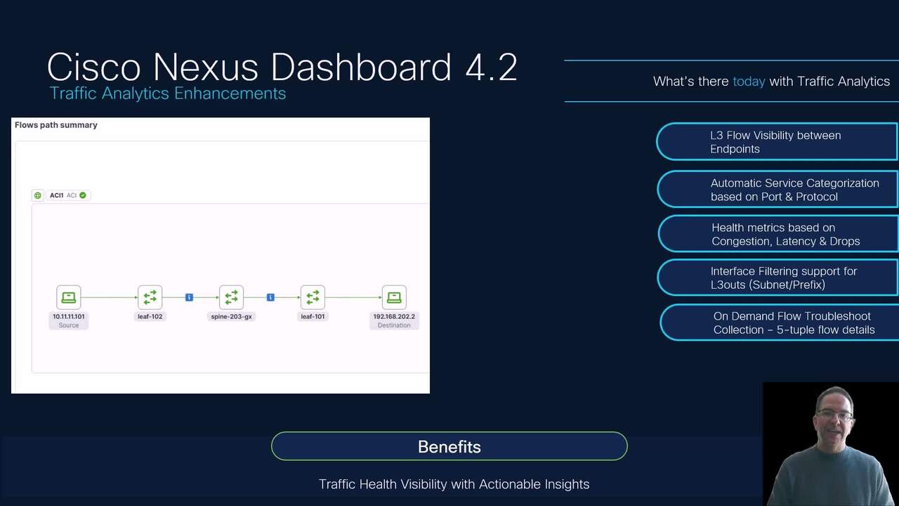 Discover how Nexus Dashboard 4.2 enhances traffic analytics with improved flow monitoring, real-time latency tracking, and simplified troubleshooting for optimized network performance.